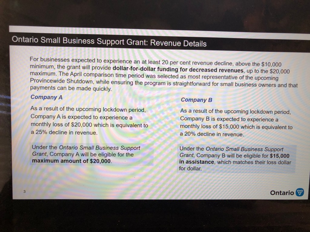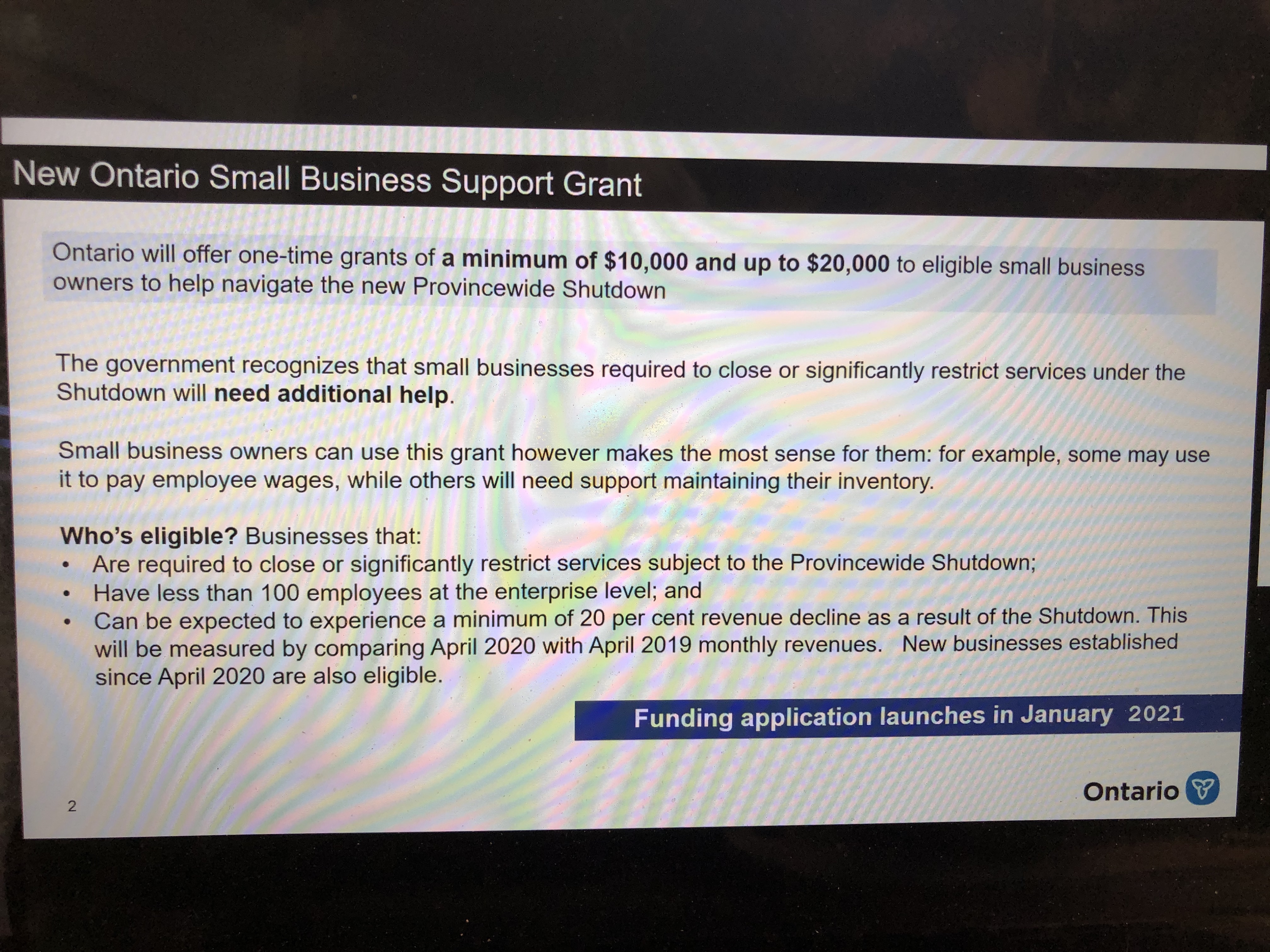 Uncategorized New Ontario SMall business Support Grant December 23, 2020 robinthemayor Ontario will offer one-time grants of a minimum of $10,000 and up to $20,000 to eligible small business ones to help navigate the new Provincial Shutdown. Portal for the grant opens in January 2021. For more details go to covid-19.ontario.ca Share this: Click to share on X (Opens in new window) X Click to share on Facebook (Opens in new window) Facebook Like Loading... Related