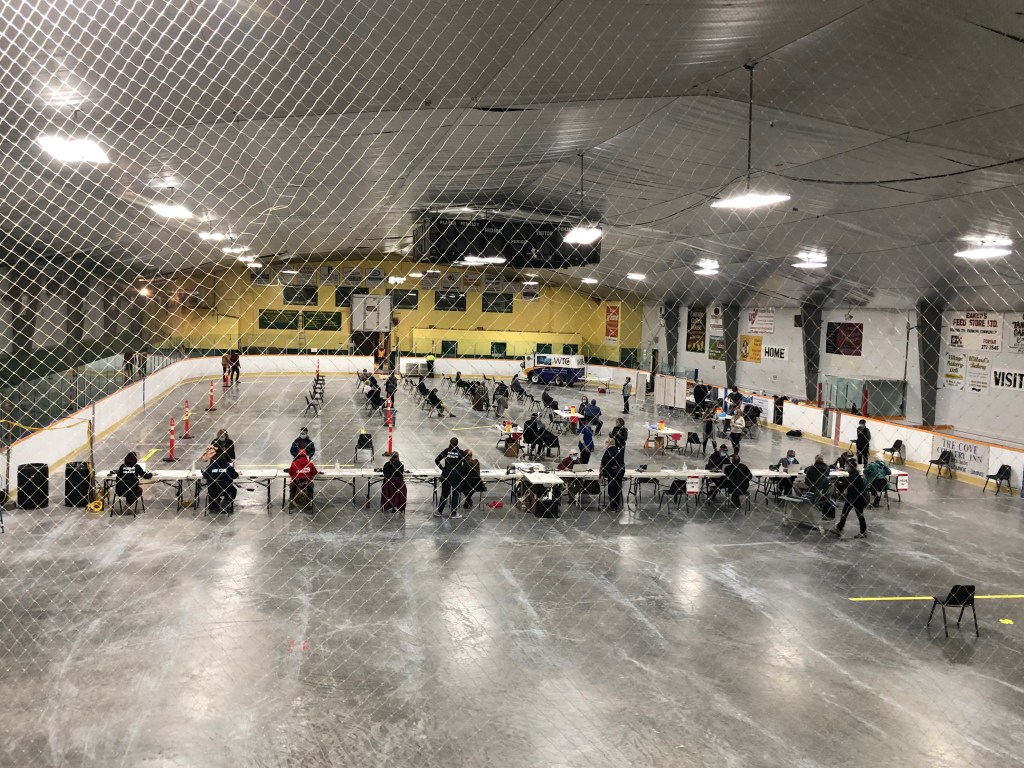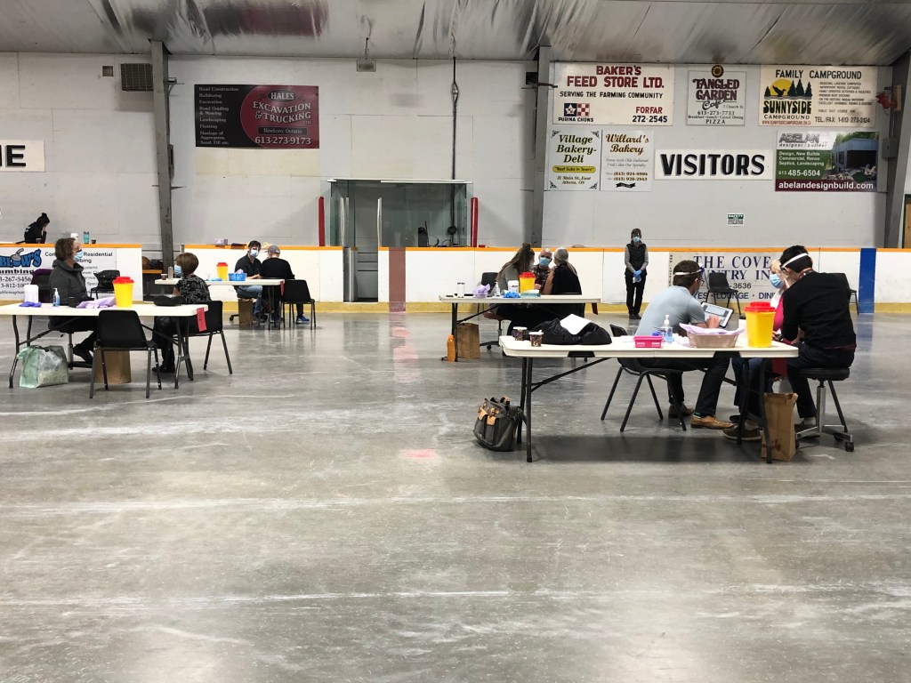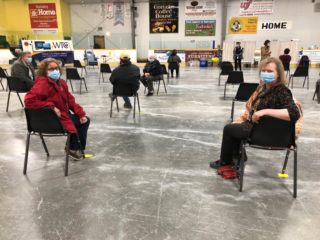 We are celebrating in Westport at the Leeds, Grenville & Lanark first pop up COVID-19 vaccination centre. Over 350 people are getting their shots today at the arena. The Health Unit have lots of staff on site and they are supported by many volunteers, the backbone of our Village.