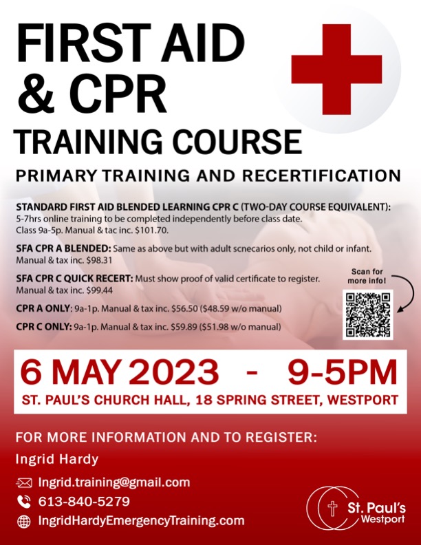 As part of its community outreach, St. Paul’s Anglican Church in Westport has teamed up with Red Cross to bring a First Aid/ CPR course to the village. The course will be delivered in the church hall, . “Our outreach program is focusing on bringing in highly qualified professionals to offer the community access to skills and learning right here in the Village,” says St. Paul’s Kim Bonner. “First aid and CPR seem like the best place to start.”